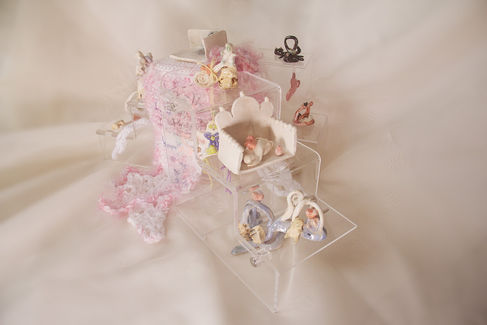 This is the first piece from the sculpture series "Conversations with here you me & them." The work contains small-scale ceramic sculptures and organic shaped crochet created by the artist from an unconscious and unplanned process, and text from an unconscious writing exercise (from movement artist Sigrid Lauren's "How to throw a body away" workshop) embroidered on the crocheted fabric. Through gentle, semi-abstract visual elements, text, and architectural structures, Tsou attempts to piece together seemingly scattered and random lines and symbolic symbols, showcasing a miniature, surreal world generated by the subconscious through visual and textual products, manifesting the flow of desires, intuitions, and illusion.